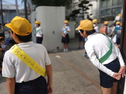 代表委員会の児童が、門に立ってあいさつ運動をしました。