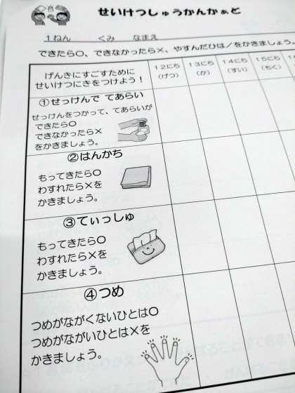 手洗い、はんかち、ティッシュ、つめ、4つの項目を毎日自分でチェックします。