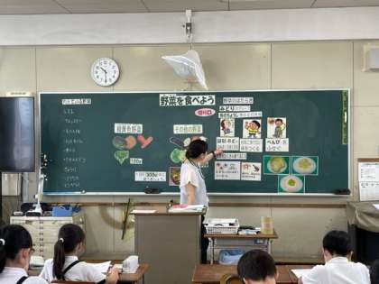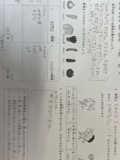 栄養教諭の先生をお招きし、緑黄色野菜とその他の野菜の違いや、野菜を食べることで体にどんな良いことがあるのか学習しました。