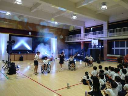体験コーナーでは、先生と代表児童が、車いすを使ったダンスをペアで体験しました。