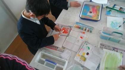 子どもたちは、自分でどんどん考えて、色を混ぜたり、技法を組み合わせたりしていました。
