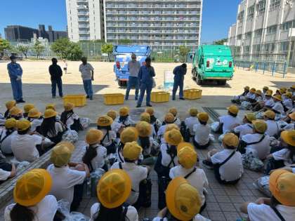 ゴミを集める時は、集める種類によって音楽が違います。今日の名前をあてる3択クイズでは、知っている曲名もありました。そのあと、用意したごみ袋を捨てたり、パッカー車の運転席に乗る体験もしました。初めて知ることもたくさんあり、これからの生活に生かせることをたくさん学びました。