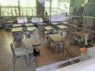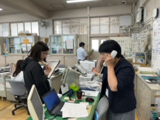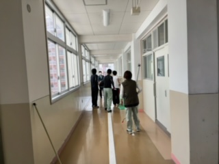 不審者が校内に侵入したという設定で、避難訓練を行いました。放送で校内に知らせるとともに110番通報、教室では隅に寄って静かにする、現場には係の教職員が向かうという流れを、警察の方の指導をいただきながら実施しました。