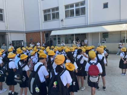 ?快晴の中、林間学習が始まりました。出発式にはたくさんの保護者の方も見送りに来てくださいました。