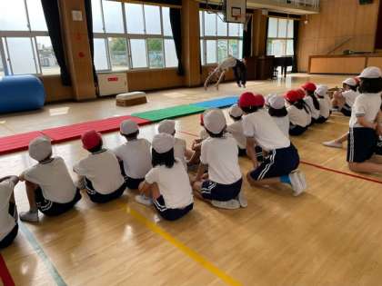 ?5年生は今日、体操のプロで活躍されていた春木 三憲(はるき みのり)先生にお越しいただき出前授業を行いました。