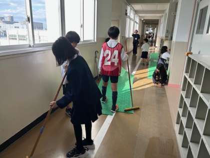 美化委員会を中心に、たてわり班で掃除をしました。1年生から6年生までみんなで協力し合って、学校をピカピカにしました。テキパキと掃除をする姿が素晴らしかったです。