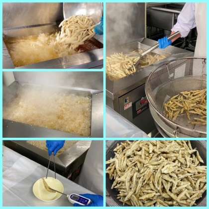 「きびなごてんぷら」は、冷凍のまま170度のなたね油で揚げ、砂糖、みりん、こいくちしょうゆ、ゆず果汁で作ったタレをかけます。