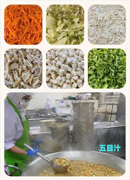 「五目汁」は、とうふ、うすあげ、キャベツ、たけのこ、にんじん、青みに青ねぎを使用しています。
