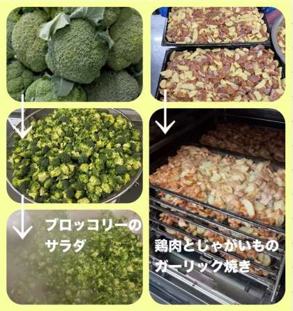 「鶏肉とじゃがいものガーリック焼き」は、にんにく、オリーブ油などで下味をつけた鶏肉に、じゃがいもを混ぜ合わせ、焼き物機で焼きます。