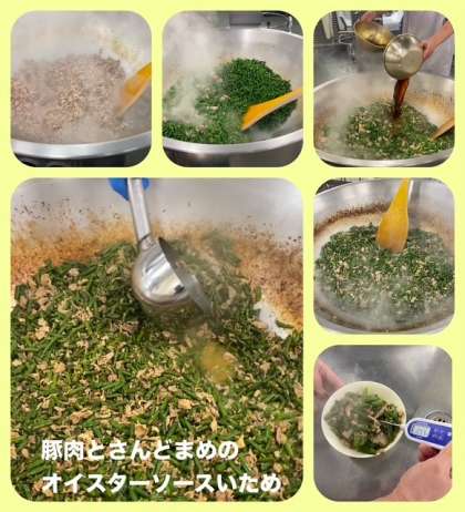 「豚肉とさんどまめのオイスターソースいため」は、豚肉、さんどまめをいため、濃口しょうゆ、オイスターソースで味付けします。