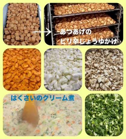 「はくさいのクリーム煮」は、鶏肉、はくさい、たまねぎ、チンゲンサイ、にんじん、しいたけ(生)を使用し、牛乳とクリームを加えて煮、でん粉でとろみをつけた中華風のクリーム煮です。