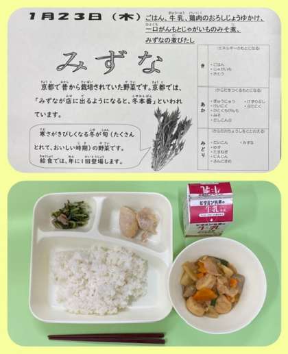 「みずなの煮びたし」は、旬のみずなと豚肉を使用した煮びたしです。豚肉で旨みを出しています。