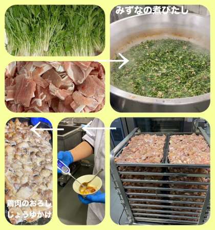 「鶏肉のおろしじょうゆかけ」は、料理酒で下味をつけ、焼き物機で焼いた鶏肉に、大根おろし、みりん、薄口しょうゆ、ゆず(果汁)で作ったタレを配缶時にかけます。