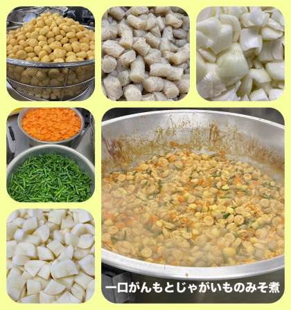 「一口がんもとじゃがいものみそ煮」は、じゃがいも、つなこんにゃく、一口がんも、たまねぎ、にんじん、青みにさんどまめを使用し、赤みそなどで味つけして煮含めた和風の煮ものです。
