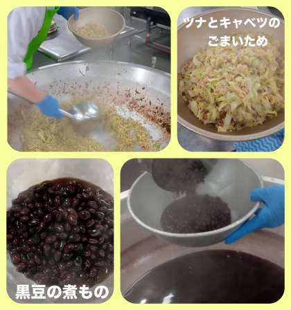 「ツナとキャベツのごまいため」は、ツナ、キャベツをいため、塩で味つけし、最後にいりごまを加えます。
