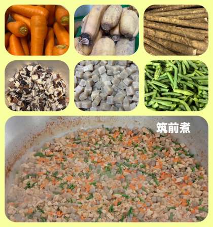 「筑前煮」は、鶏肉を主材に、れんこん、ごぼう、にんじんなどの野菜をいため、だしを加えて煮、味つけして煮含めた福岡県の郷土料理です。