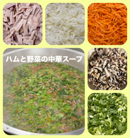 「ハムと野菜の中華スープ」は、ハム、たまねぎ、にんじん、しいたけ、チンゲンサイを使用し、塩、こしょう、薄口しょうゆ、中華スープの素で味つけしたスープです。