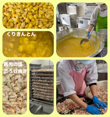 「鶏肉の塩こうじ焼き」は、鶏肉(もも皮無大)に塩こうじで下味をつけ、たまねぎを混ぜ合わせ、焼き物機で焼きます。