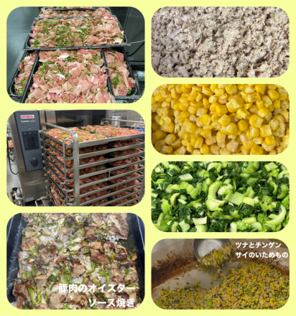 「豚肉のオイスターソース焼き」は、豚肉にしょうが汁、にんにく、オイスターソース、濃口しょうゆ、綿実油で下味をつけ、ピーマンを混ぜ合わせ、焼き物機で焼きます。