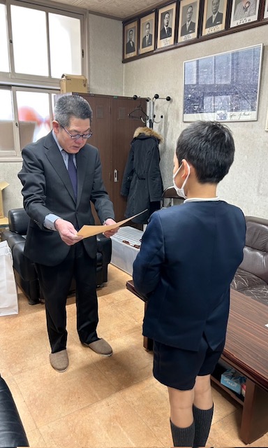 城東税務署の署長から、優秀賞を受賞した児童へ、賞状と記念品の授与がありました。
