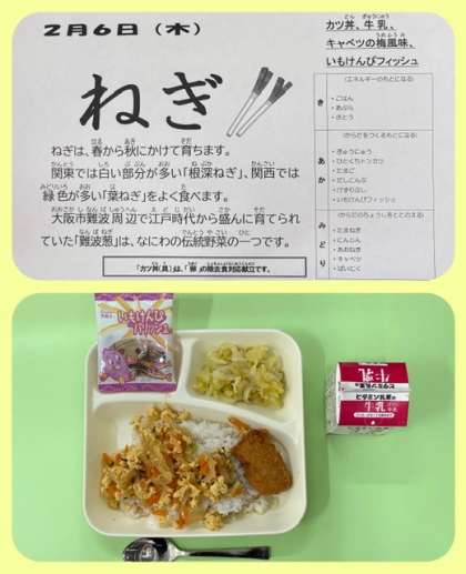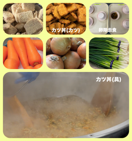 「カツ丼(具)」は、たまねぎ、にんじん、青ねぎを煮て味つけし、液卵を流し入れます。配食時に「カツ丼(具)」をご飯の上にかけ、「カツ丼(カツ)」をのせます。この献立は【卵の除去食】対応です。