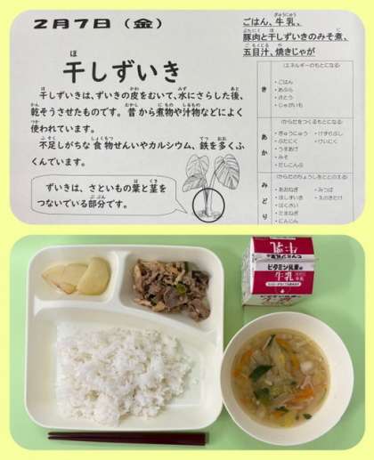 「豚肉と干しずいきのみそ煮」は、豚肉、干しずいき、うすあげ、青ねぎを使用し、砂糖、みりん、濃口しょうゆ、赤みそで味つけした煮ものです。