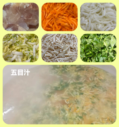 「五目汁」は、鶏肉、はくさい、たまねぎ、にんじん、えのきたけ、青みにみつばを使用しています。