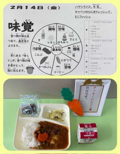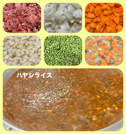 「ハヤシライス」は、牛肉を主材に、にんじん、たまねぎ、じゃがいもなどを使い、水どき上新粉でとろみをつけ、調味料で味つけして煮こみます。ハート型のラッキーにんじんが入っています。