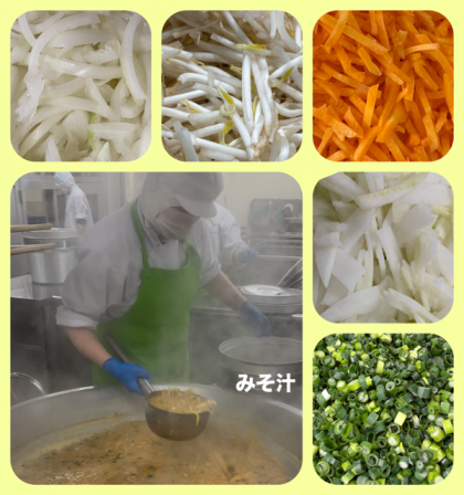 「みそ汁」は、だいこん、たまねぎ、にんじん、もやしを使用し、青みに青ねぎを使用しています。
