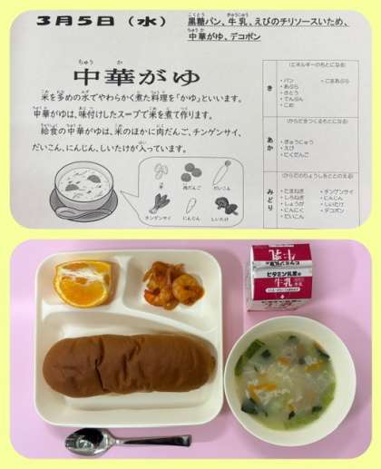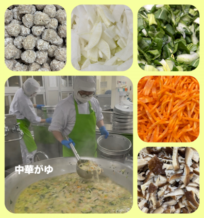 「中華がゆ」は、米、肉だんご、だいこん、にんじん、しいたけ、彩りにチンゲンサイを使っています。