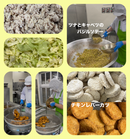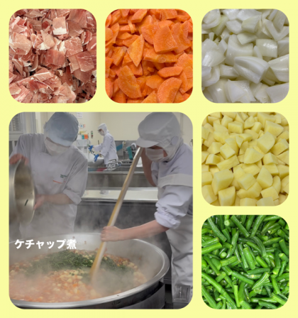 「ケチャップ煮」は、豚肉、じゃがいも、たまねぎ、にんじん、青みにさんどまめを使用し、ケチャップ、チキンブイヨンなどで味つけしています。