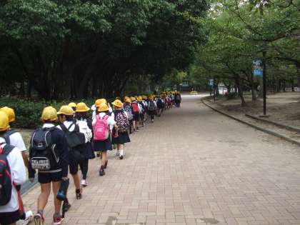 写真(1) 広い道でもきっちりと整列して歩く、さすが3年生。