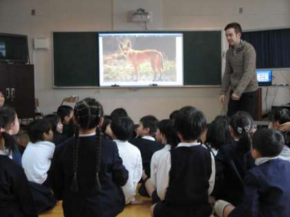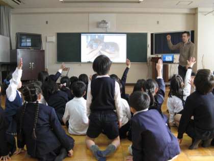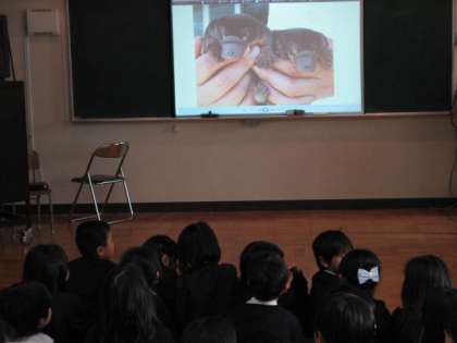 担任の先生と一緒に、英語のネィティヴ スピーカーのバロン先生に、低学年の子どもたちも英語を指導していただきました。写真や絵を見ながら、オーストラリアの珍しい動物を紹介してもらい、子どもたちも喜んでいました。