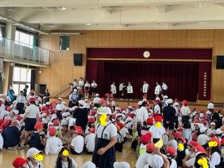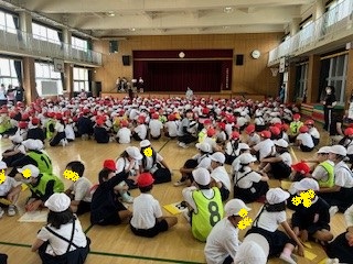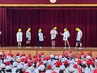 たてわり班集会がありました。1年生も班に入り、自己紹介ゲームを楽しみました。高学年児童がリードしながら、活動しました。「1年間よろしくお願いします。」