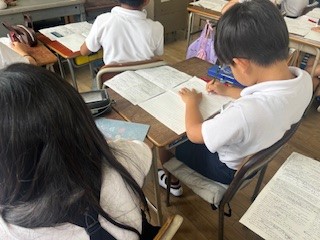 4年生の国語の学習の様子です。物語の山場となる一文を見つける学習をしました。自分の意見を持ち、友だちと交流することで、さらに考えを深めることができました。