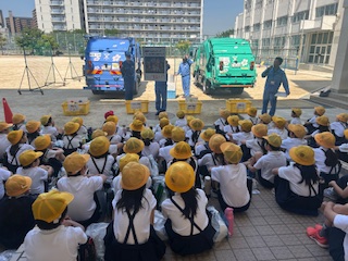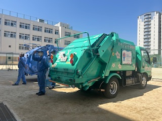4年生の学習で、2台のパッカー車が学校に来ました。大阪市のゴミ処理の仕組みについて話を聞き、パッカー車の秘密をいろいろ知ることができました。