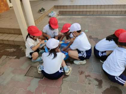 冷たい水を楽しむ子もいれば、汚れが取れなくて苦戦してる子もいました。
