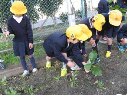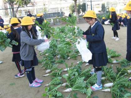 1・2年生が自分たちで、秋から種を植えて、冬野菜を育てていました。先日、合同で収穫祭を行いました。1年生がかぶ、2年生が大根を収穫して大喜びでした。全員に大きな作物を・・というほどは収穫できず、じゃんけんで負けてしまって、かわいいかぶをもらった子もいますが、楽しい時間を過ごしました。