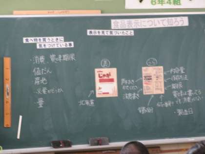 栄養士の先生が来校し、賞味期限について栄養指導をしていただきました。6年生たちはもうすぐに、自分たちで買い物をしたり、料理をしたりするようになるでしょう。その時に、今回の賞味期限(食べられる期間が短い食べ物用)や消費期限(食べられる期間の長い食べ物用)の話は、必ず、役に立ちます。子どもたちも、真剣に聞いていました。