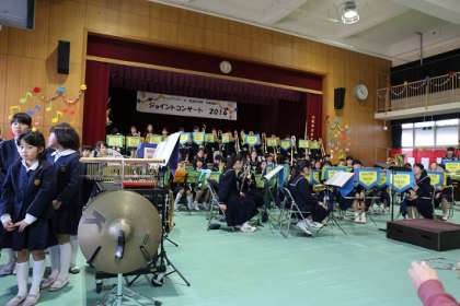 毎年、恒例の行事として地域に定着し、今年も講堂が保護者や地域の方でいっぱいになりました。また、放出ジュニアバンドを卒業していった先輩も、児童の指導に力を貸してくれます。当日は指揮者として出演してくれました。