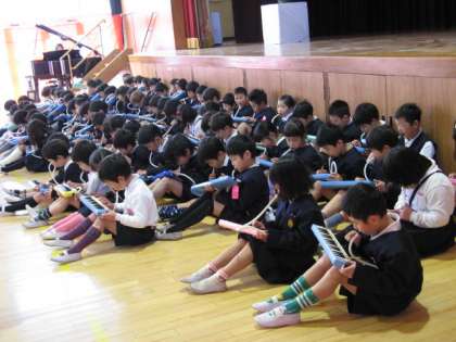 入学式に向けて、新2年生たちが歓迎の言葉と演奏・歌を練習していました。当日の発表に向けて、ひとりひとりが熱のこもった練習でした。何度も練習を重ねて、本番ではすばらしい演技を披露してくれました。新入生たちも熱心に聞いていました。