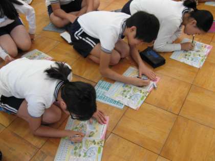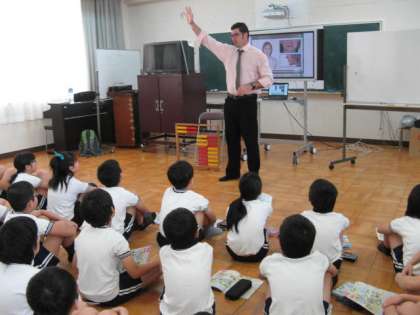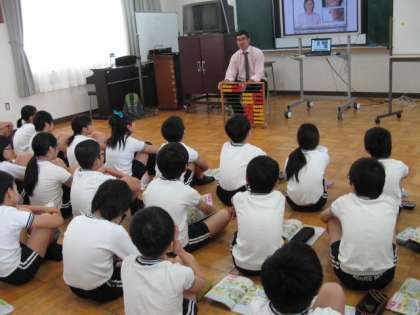 今年はオーストラリア人のマシュー・ゲール先生と、担任が一緒に英語を指導しています。マット先生は身長180cmを超えるとても背の高い先生です。いつも、子どもたちと英語を学習することが大好きだとおっしゃっています。
