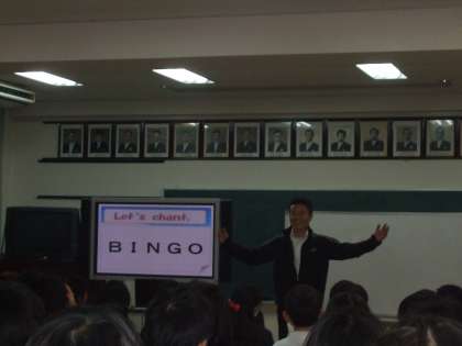 挨拶を英語で行ったあと、「BINGOの歌」にのってリズム遊びをしたり、手や指でアルファベットの形を作る遊びをしたりしました。