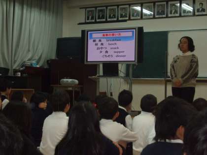 今日のメインは、食べ物の言い方です。ピザやケーキなど、ふだん聞きなれている言葉がたくさん出てきましたが、ALT(Assistant Language Teacher )の発音に耳をかたむけて、英語と日本語の発音の違いに気をつけて発音練習をしました。