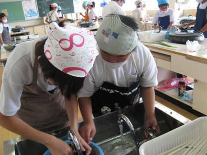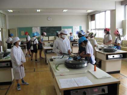 6年生たちがチヂミ作りを行っていました。さすがに、6年生です。手際よく野菜を洗ったり、切ったりしていました。ごま油のいい匂いがして、上手にホットプレートでチヂミを焼いていました。