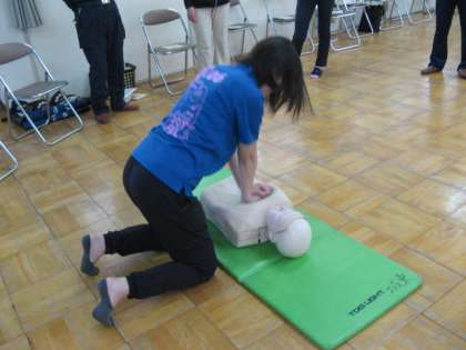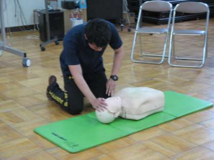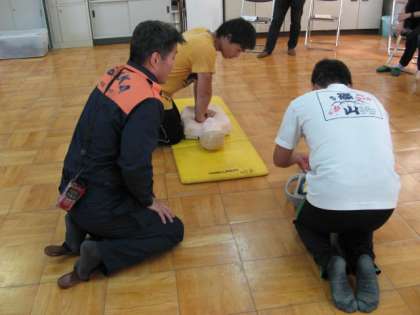 本校では毎年夏に、全教職員対象にAED(自動体外式除細動機)の講習会を行っています。今年は消防署の方にも来てもらい、モデル人形を使って、AEDの使い方をしっかりと学習しました。
