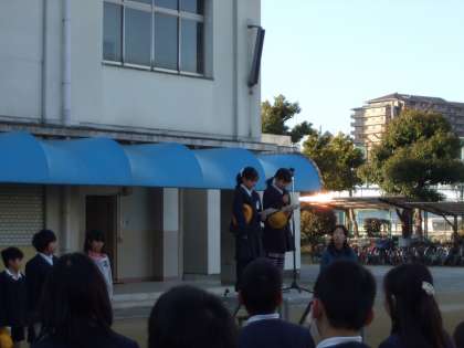 児童朝会では、給食委員会から調理員へ、日ごろの感謝をこめて感謝状が贈られました。