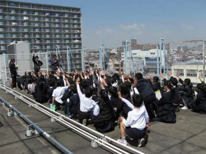 屋上からも学校の周りを観察しました。「高いマンションが多いね。」「生駒山が見えるよ。」「川がまっすぐ流れているよ。」たくさん、発見しノートにメモすることができました。