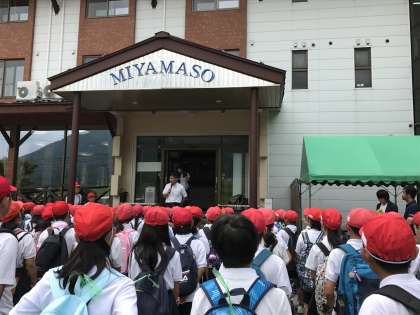 11時25分、みやま荘に無事到着しました。みんな元気です。開舎式でみやま荘のみなさんにあいさつをしました。