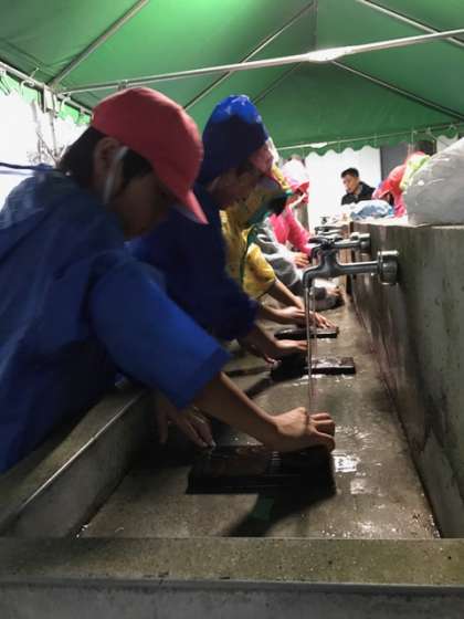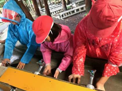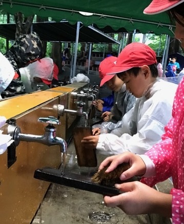 午後から登山の予定でしたが、焼き板作りに変更して活動しています。木についた煤をたわしでこすってきれいにしています。